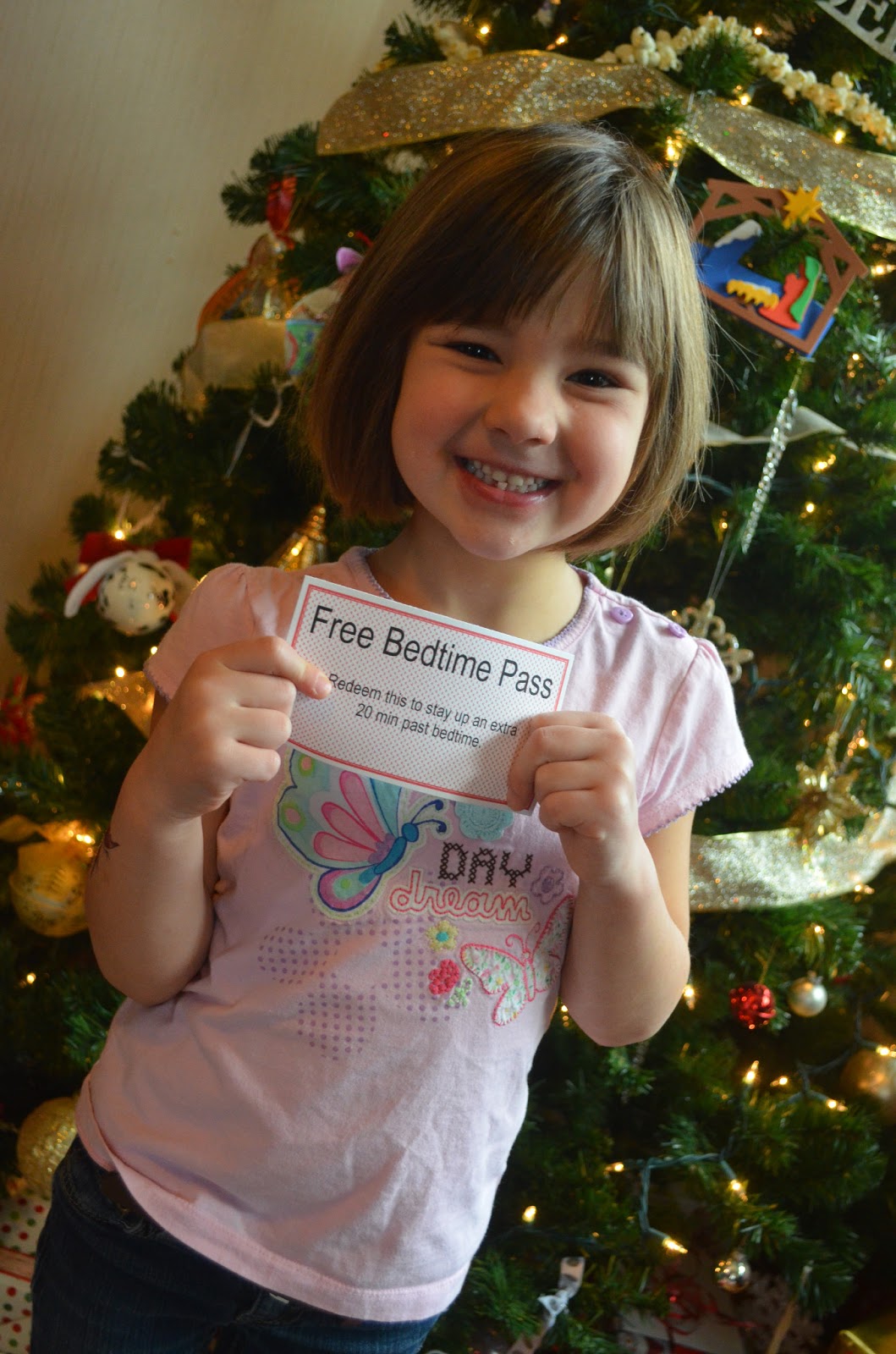 And these I forgot to put IN the stockings! But at least remembered that same morning! Bedtimes passes for them to each stay up an extra 20 min when redeemed. They loooved these and wanted to use them that night so they could do Christmas when Daddy got home from work! I assured them that it was a holiday and they could stay up later anyway. So sweet. Eli and Hannah redeemed their coupons within the first week though. Love how they treasure that extra time together and will try to remember to give them as other gifts as well! =)